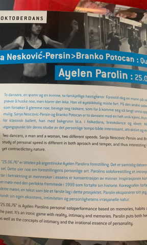 Création le 17 octobre 2004, Festival Octoberdance/Bit Teatergarasjen (Bergen, NO)